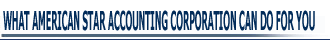 American Star Accounting Corporation (ASAC) was created to meet the needs of small- to medium-sized businesses as well as individuals requiring professional accounting and financial services. Our backgrounds were diverse, but complimentary-each brought a different set of strengths to the firm, enabling us to provide clients a broad range of expertise. Over the past two decades we have built our firm on the solid foundation provided by long-term relationships based on trust. We help our corporate clients achieve success in their businesses, and guide our individual clients toward achieving their personal financial goals.